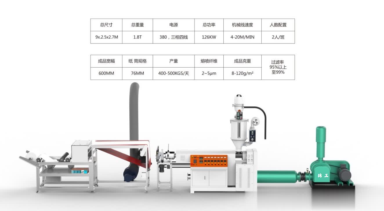 目前市場上面的設(shè)備大小生產(chǎn)線比較多,從300到3200mm寬幅都有,配置也是有很大的區(qū)別,熔噴布設(shè)備主要核心部件在于: ?羅茨鼓風(fēng)機(jī),空氣加熱器,自動吸料烘干機(jī),單螺桿擠出機(jī),過濾器,熔體計(jì)量泵,噴絲模頭,接布臺,靜電駐極機(jī),切布及卷布。