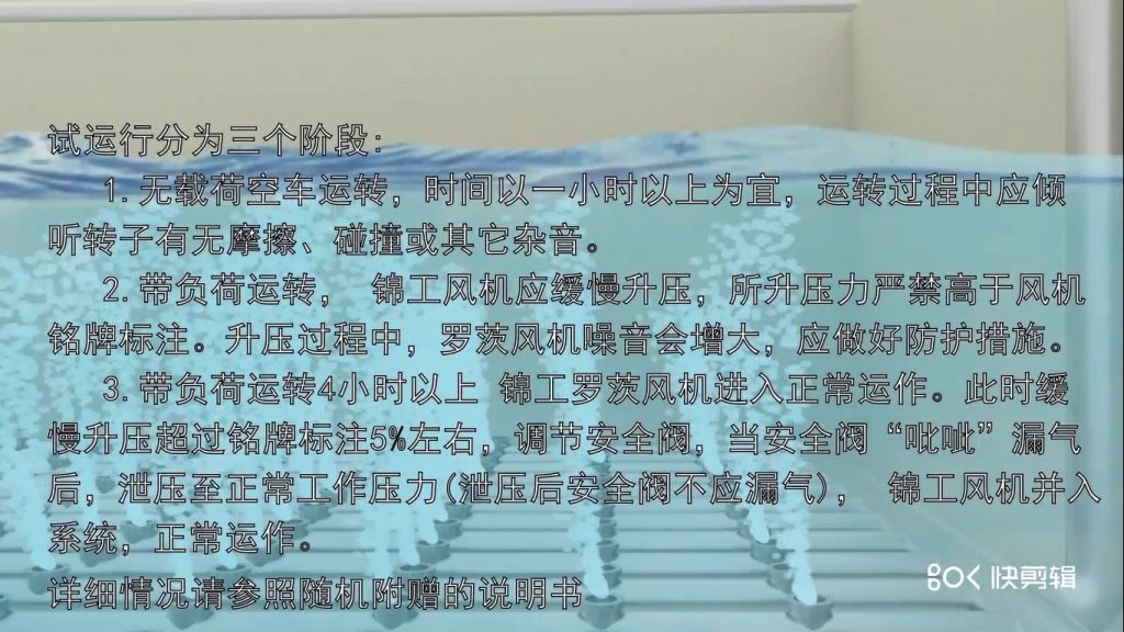 相關(guān)人員遠(yuǎn)離鼓風(fēng)機(jī)機(jī)組2米以外,進(jìn)行開機(jī)試運(yùn)行,試運(yùn)行分為三個(gè)階段: