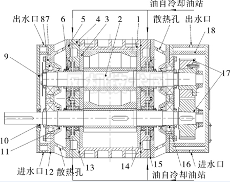 1. 機殼 ; 2. 轉(zhuǎn)子部; 3. 側(cè)板; 4. 隔板; 5. 墻板; 6. 機械密封部; 7. 軸承; 8. 軸承座; 9. 副油箱; 10. 骨架油封; 11. 骨架油封; 12. 油箱密封墊; 13.O 形圈; 14. 側(cè)板密封墊; 15. 墻板密封墊; 16. 軸承; 17 . 齒輪部 ; 18. 齒輪箱 .